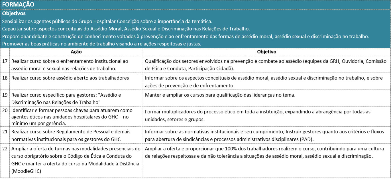 Assim, o GHC afirma padrões de comportamento ético, em conformidade ao seu Código de Ética e Conduta, e, buscando alcançar relações profissionais saudáveis, em ambientes respeitosos e éticos, institui Campanha de Prevenção e Enfrentamento do Assédio e da Discriminação nas Relações de Trabalho no Grupo Hospitalar Conceição.