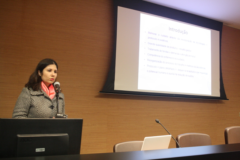 A mestranda Raquel Farias Rozeno deu continuidade ao evento com a sessão de defesa da dissertação “Implantação e avaliação de um protocolo de feridas em unidades de Estratégia de Saúde da Família de um município do interior do Rio Grande do Sul”.