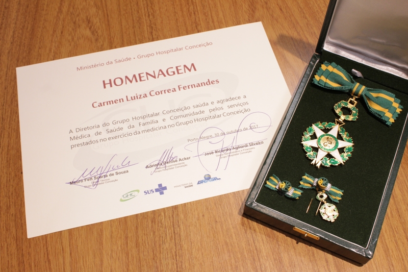Graduada em Medicina pela Universidade Federal de Pelotas (UFPel), pós graduada em Saúde Mental Coletiva e Mestre em Epidemiologia, Carmen Luiza Correa Fernandes recebeu na tarde desta segunda-feira, 30 de outubro, uma homenagem da diretoria do Grupo Hospitalar Conceição (GHC). Especialista em medicina da família e comunidade da Unidade de Saúde Barão de Bagé (US Barão de Bagé), Carmen também foi prestigiada, no dia 17 de outubro, com a Comenda da Ordem do Mérito Médico, entregue pelo Presidente da República, Michel Temer e pelo Ministro da Saúde, Ricardo Barros.