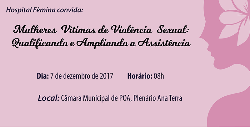 O Hospital Fêmina, em parceira com a Procuradoria Especial da Mulher, realizará no dia 7 de dezembro, o evento "Mulheres Vítimas de Violência Sexual: Qualificando e Ampliando a Assistência", no Plenário Ana Terra da Câmara Municipal de Porto Alegre.