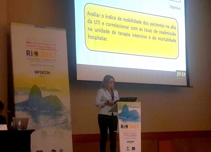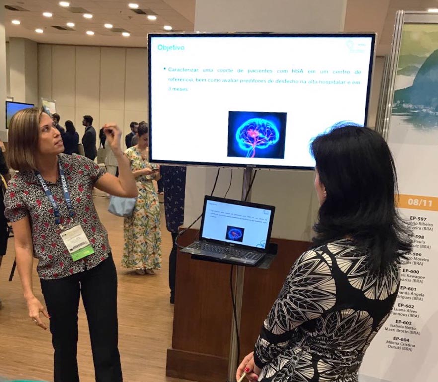 Dois trabalhos do HCR foram apresentados durante o encontro: apresentação oral "Relationship between ICU Mobility Scale and hospital mortality in Intensive Care Unit patients", de Fernanda Kutchak; e apresentação de pôster "The functional outcome after hospital discharge in aneurysmal subarachnoid hemorrhage patients: data from a cohort in a public reference hospital Southern Brazil", de Carla Rynkowski.