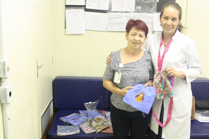 Apoiada pela chefia, a técnica de enfermagem produziu 19 bolsinhas feitas de tecido de algodão. Algumas aplicações com figuras ou detalhes bordados deixam o trabalho mais divertido. Todo material produzido é feito com sobras dos tecidos de artesanato, ou seja, é totalmente doado, um trabalho voluntário.