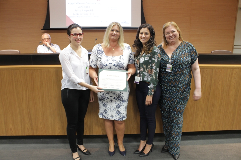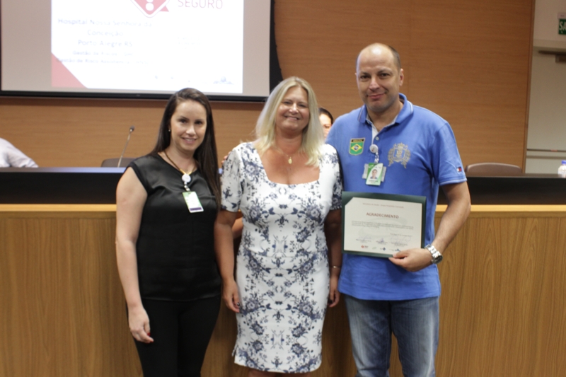A diretora-superintendente, Adriana Denise Acker parabenizou todas as equipes que estiveram envolvidas no projeto e destacou que é importante reconhecer os profissionais quando o trabalho é bem feito. "É importante para nós da diretoria estar reconhecendo os trabalhos realizados, a gente aprendeu que cada singela homenagem tem um significado muito grande para aqueles que trabalham aqui". Durante a sua fala, ela entregou o certificado para três equipes envolvidas no projeto: a equipe de Gestão Assistencial do HNSC, a Coordenação de Enfermagem do HNSC e a equipe da Gestão de Riscos do GHC.