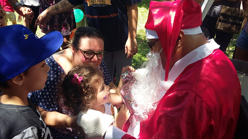 Vestido de Papai Noel, um dos usuários da unidade e integrante do Conselho Local de Saúde, fez a entrega dos brinquedos doados pelos trabalhadores do GHC, usuários e comerciantes da região. Durante o evento, também foram distribuídos lanches, além da realização de atividades de lazer e cultura, como oficina de turbantes, ônibus brincalhão e brinquedos infláveis.