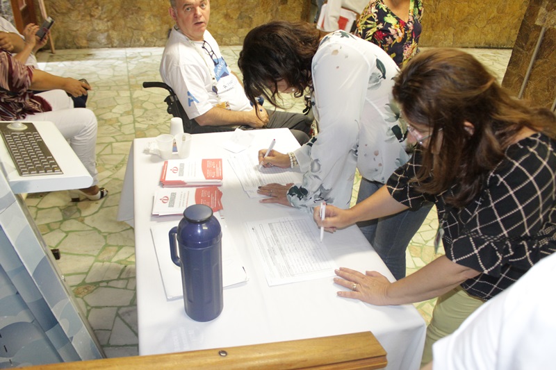 A percepção da leitura braile também foi apresentada. Também foi explicado que para cada folha escrita são necessárias quatro folhas para impressão em braile. Ao final, os participantes foram convidados a deixar suas impressões no mural das sensações.
