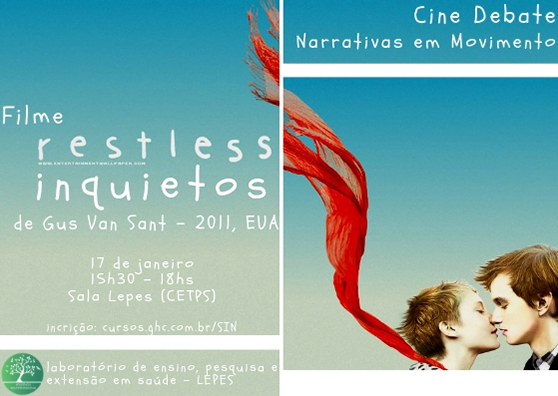 A Residência Multiprofissional em Saúde e o Laboratório de Ensino, Pesquisa e Extensão em Saúde (Lepes) da Gerência de Ensino e Pesquisa do Grupo Hospitalar Conceição (GEP/GHC) promovem no próximo dia 17 de janeiro, das 15h30min às 18h, o Cine Debate Narrativas em Movimento. O evento será realizado no Centro de Educação Tecnológica e Pesquisa (CETPS), na Av.Francisco Trein, 326, na sala 13 do Lepes. Em um primeiro momento, a atividade irá contar com a exibição do filme Inquietos (Reptless, direção de Gus Van Sant, EUA, 2011), depois ocorrerá um debate sobre a relação do filme com a saúde mental, como o luto e a depressão.