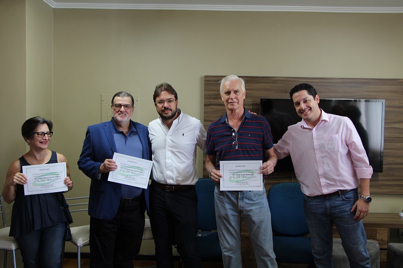 O médico ginecologista Jorge Inácio Hartmann, há 33 anos na instituição, o médico neonatologista Luís Eduardo Soares Petrucci, há 32 anos no HF, e a médica neonatologista Hilda Maria Lucena Borges, funcionária há 29 anos do HF, se despediram dos colegas que lotaram a sala da Sede da AMEHF para a confraternização. Na ocasião, os médicos agradeceram o convívio com as equipes e a dedicação para o sucesso da assistência do HF.