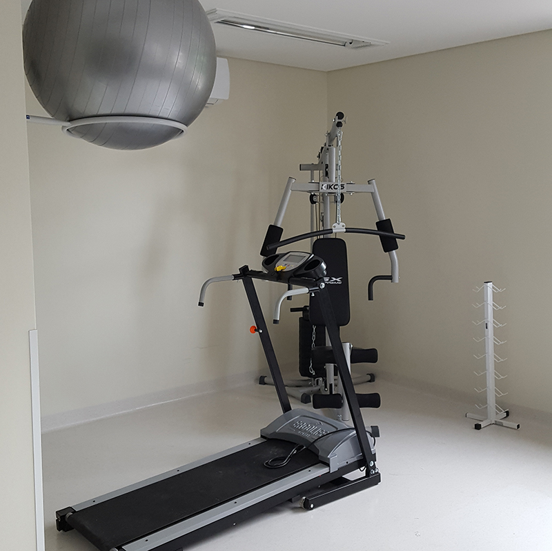 O local conta com equipamentos como tatames, esteira, suporte de peso, estação de musculação, barra paralela, bolas com suporte, muletas, andadores, entre outros.
