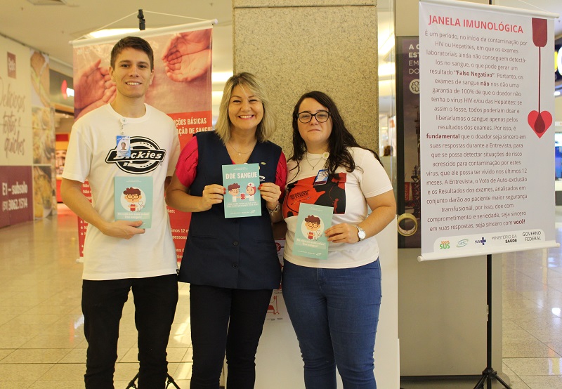No estande, dois bânneres com informações sobre a doação, além de profissionais prestando esclarecimentos específicos e distribuindo fôlderes com informações sobre o funcionamento do Banco de Sangue do GHC. Além da coordenadora Andrea, participam da ação a estagiária Mariana Schimidt e o fisioterapeuta residente do Programa de Gestão em Saúde da Residência Multiprofissional em Saúde do GHC Eduardo dos Santos Cardoso, que se engajou na causa.