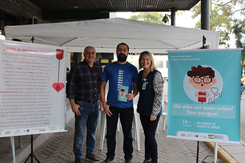 Com objetivo de promover uma ação educativa junto aos usuários dos serviços de saúde e cidadãos que circulam pelo espaço do Hospital Nossa Senhora da Conceição (HNSC), o Grupo Hospitalar Conceição (GHC), realizou na última sexta-feira, evento alusivo ao Dia Mundial do Doador de Sangue, ocorrido no último dia 14 de junho. Foi montada uma tenda na frente da instituição onde a população recebia informações sobre os benefícios da doação de sangue e sua importância aos serviços oferecidos pelos hospitais do grupo.