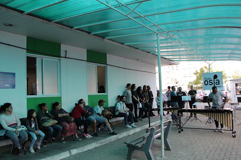 A UPA Moacyr Scliar recebeu o projeto Ospa na Comunidade na tarde dessa quinta-feira, dia 11 de julho. A atividade reuniu 11 alunos de percussão da Escola de Música da Ospa, que tocaram músicas populares para o público presente no pátio interno da unidade.