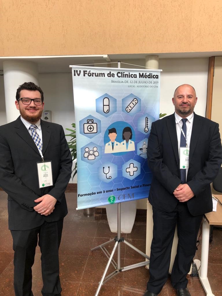 O gerente de Internação do Hospital Nossa Senhora da Conceição(HNSC), Rafael Ribeiro e o médico clínico da medicina interna, Márcio Spagnol estão participando hoje, 12, do IV Fórum de Clínica Médica que está acontecendo, na sede do Conselho Federal (CFM) de Medicina em Brasília.
