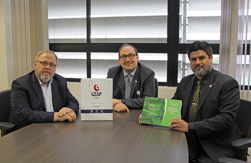 O diretor administrativo e financeiro do Grupo Hospitalar Conceição, Cláudio Oliveira, e o diretor técnico, Francisco Paz, receberam na tarde desta terça-feira, 23 de julho, a visita de José Henrique Westphalen, gerente estadual do GEAP Saúde, vinculado à Casa Civil da Presidência da República. Em visita de cortesia, Westphalen veio conhecer o GHC.