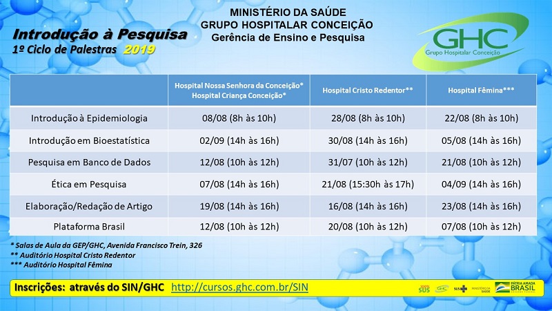 Esta atividade, executada de forma itinerante, será realizada nas unidades hospitalares que compõem o GHC como forma de incentivar o desenvolvimento de atividades científicas na instituição.