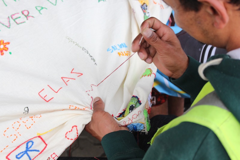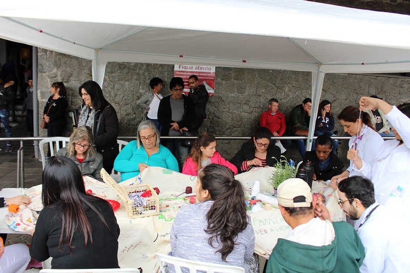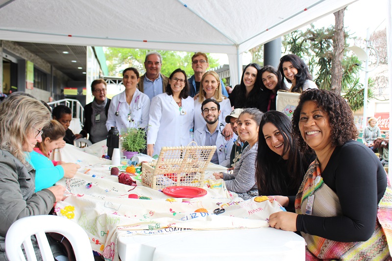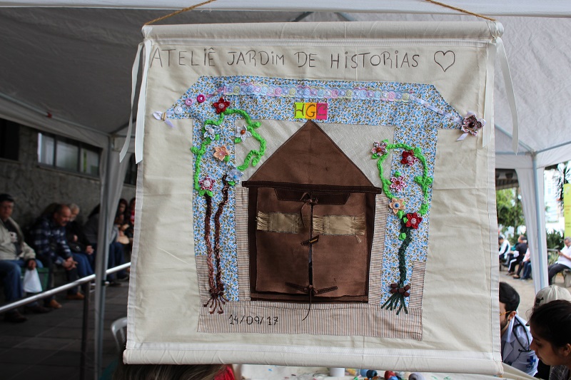 Foi realizado nessa quinta-feira, 3 de outubro, em frente ao Hospital Conceição, encontro e confraternização do Grupo Ateliê Jardim de Histórias. Ao longo do dia, pacientes do Serviço de Dor e Cuidados Paliativos que frequentam o Ateliê deram uma mostra do trabalho realizado durante os encontros do grupo. A cada encontro, e com frequência quinzenal, esses pacientes são reunidos em volta de uma mesa, sob coordenação de integrantes do Núcleo de Psicanálise, Educação e Cultura (NUPPEC/UFRGS) e de artistas do coletivo A Carroça, para bordar uma toalha, além de conversar sobre suas histórias.