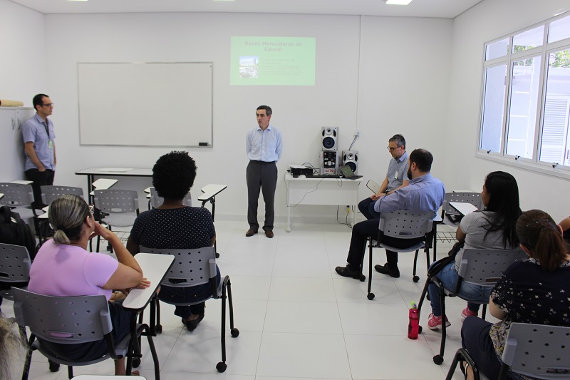 O oncologista clínico do GHC Gustavo Vasconcelos Alves ministrou a primeira aula do curso. O plano de ensino tratará, entre outros temas, a epidemiologia do câncer e conceitos introdutórios sobre fisiopatologia, os cuidados de enfermagem com o paciente oncológico, a segurança do paciente e a segurança do profissional da saúde.
