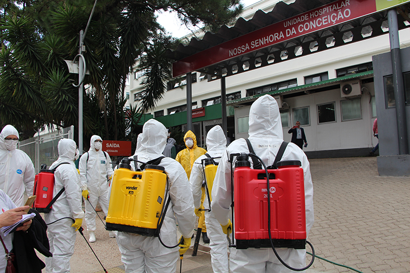 Nessa quinta-feira, 16 de abril, militares da Marinha, Exército, Aeronáutica e Polícia Rodoviária Federal realizaram uma desinfecção com ação bactericida na área do Centro de Triagem Covid-19 do Grupo Hospitalar Conceição (GHC) e em frente ao Hospital Conceição. A operação, que tem como objetivo prevenir a contaminação pelo novo coronavírus, é realizada por meio da Defesa Civil.