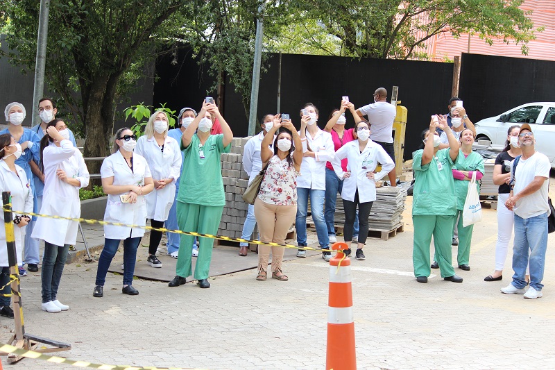 Uma ação voluntária de alpinistas da empresa Executar mobilizou os funcionários do Hospital Conceição na tarde dessa quarta-feira, 29 de abril. Com o objetivo de homenagear os profissionais da saúde, os alpinistas desceram de rapel o prédio do hospital com mensagens de agradecimento. Num primeiro momento, eles exibiram cartaz com o “Muito obrigado” para os profissionais das enfermarias. Na sequência, fixaram um grande banner na entrada dos funcionários, também com homenagem, ao som de aplausos do público presente.