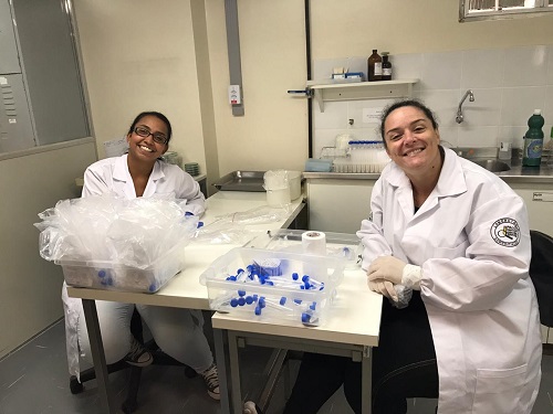 Outra ação do Laboratório envolve a colaboração dos funcionários na montagem de kits de coleta para o exame PCR. Os kits com SWAB são disponibilizados pela Secretaria Municipal da Saúde, entretanto, para garantir a continuidade das coletas neste período da pandemia, um grupo multidisciplinar da equipe do Laboratório montou os kits durante sua rotina de trabalho.