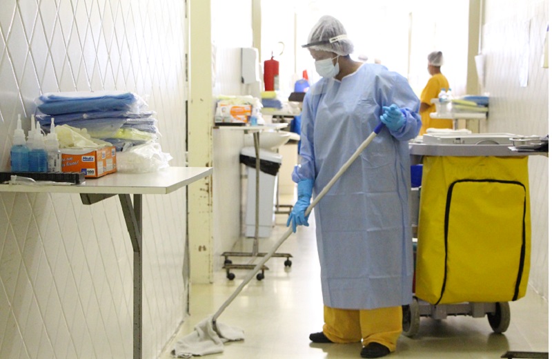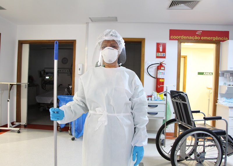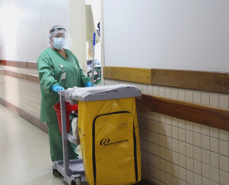 A higienização hospitalar caracteriza-se por processo de trabalho repleto de técnicas de limpeza diferenciadas das domésticas, como o sentido: da área menos contaminada para a mais contaminada e diferenciação entre superfícies baixas e altas. O produto utilizado na higienização é o mesmo que o hospital já utilizava, pois é eficaz também no combate ao Covid-19. O uniforme usado depende da área de atuação: uniforme verde nas áreas de menor risco e uniforme laranja nas de maior risco. Foram ampliados EPIs para todas áreas, as de menor risco utilizam máscara cirúrgica, escudos faciais e EPIs padrão. Já os higienizadores que atuam na áreas Covid utilizam a mesma paramentação que médicos, enfermeiros e técnicos em enfermagem.