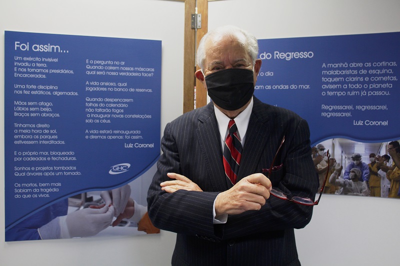 Foi inaugurada na manhã desta quinta-feira, 17 de setembro, a Mostra Poesia para Heróis, no Memorial do Grupo Hospitalar Conceição, térreo do Centro Administrativo GHC. A exposição traz painéis com poemas de Luiz Coronel ilustrados com imagens da instituição durante este período de pandemia. Os poemas foram doados pelo renomado poeta com a intenção de valorizar o trabalho que vem sendo realizado pelo GHC no combate à Covid-19. Ao todo são dez poemas sobre este momento de vida em meio à pandemia do novo coronavírus.