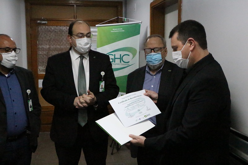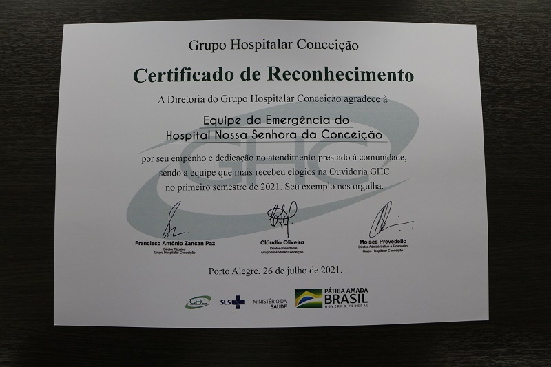 Coordenadores e representantes das categorias funcionais estiveram presentes no ato que reconheceu o empenho e a dedicação da equipe. O gerente de Interunidades de Emergências do GHC, Cleber Verona, agradeceu em nome de todos, destacando o orgulho dessa conquista, especialmente neste período de pandemia, quando “a equipe têm desempenhado seu papel com maestria”.