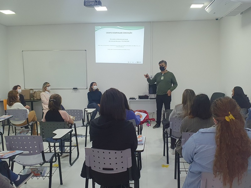 Os novos alunos foram recebidos pela equipe da GEP/GHC. A gerente Bruna Donida deu às boas-vindas aos alunos e comentou sobre a importância do desenvolvimento de habilidades interpessoais, em conjunto com o conhecimento técnico, visto que o profissional técnico de enfermagem lida diretamente e tem papel fundamental no cuidado dos pacientes. O assistente de coordenação Juliano de Oliveira Guterres fez uma breve apresentação sobre o Grupo Hospitalar Conceição e sobre a Gerência de Ensino e Pesquisa. Já a responsável pelo Curso Técnico em Enfermagem, Michele da Rosa Ferreira, deu continuidade à aula inaugural, juntamente com as enfermeiras Cecilia Biasibetti Soster e Dinara Dornfeld e com a bibliotecária Luciane Berto Benedetti, membros do corpo docente.