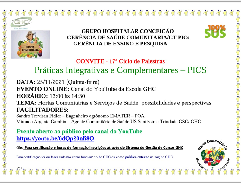 A Gerência de Ensino e Pesquisa realiza nesta quinta-feira, 25 de novembro, de forma remota, o Ciclo de Palestras e Práticas Integrativas e Complementares (PICs). O tema da palestra será "Hortas Comunitárias e Serviços de Saúde: possibilidades e perspectivas", tendo como facilitadores o engenheiro agrônomo da Emater/POA Sandro Trevisan Fidler e a agente de saúde comunitária da Unidade de Saúde Santíssima Trindade Miranda Argenta Gambim. As inscrições podem ser feitas até esta terça-feira, 23, por meio do link: https://cursos.ghc.com.br/SIN/verEdital/34730