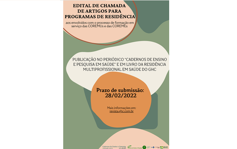 A Gerência de Ensino e Pesquisa do Grupo Hospitalar Conceição (GEP/GHC), por meio da Residência em Área Profissional da Saúde (Coremu), divulga o edital de chamada de artigos para publicação no periódico "Cadernos de Ensino e Pesquisa em Saúde" e em livro da Coremu.