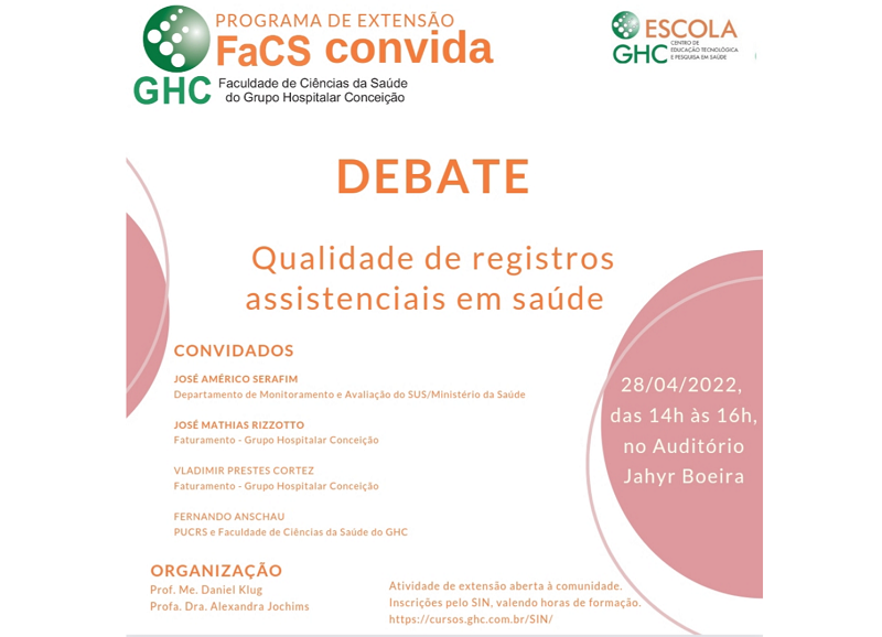 Na próxima quinta-feira, 28 de abril, às 14 horas, a Faculdade de Ciências da Saúde do Grupo Hospitalar Conceição (FaCS/GHC) promoverá o debate "Qualidade de registros assistenciais em saúde". A atividade de extensão ocorrerá no Auditório Jahyr Boeira de Almeida, no Centro Administrativo GHC, e é aberta à comunidade. As inscrições são feitas pelo Sistema de Gestão de Cursos do GHC, valendo horas de formação.