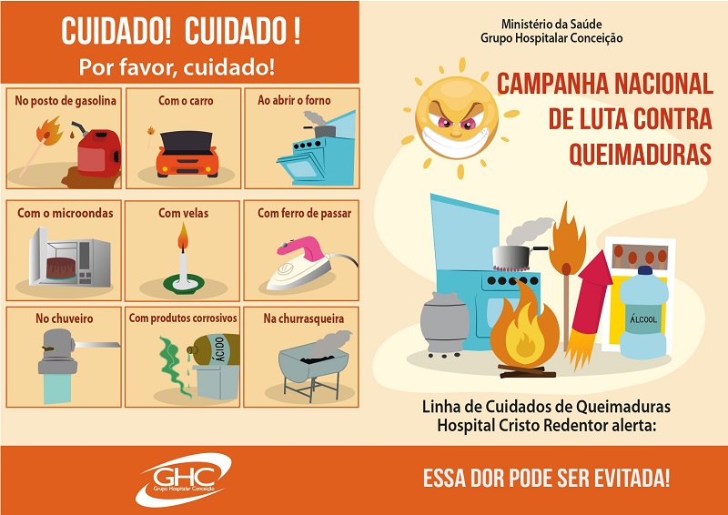 Neste domingo, dia 26 de junho, profissionais da Unidade de Queimados e da Emergência do Hospital Cristo Redentor (HCR) estarão realizando, no Parque da Redenção, em Porto Alegre, a Campanha de Prevenção de Queimaduras, em alusão ao Dia Nacional de Luta contra Queimaduras, comemorado em 6 de junho. Com início às 8h30 e término às 16h30, na entrada da Avenida José Bonifácio, a equipe multiprofissional, supervisionada pela médica Maria da Graça Figueira Costa, distribuirá fôlderes educativos e dará orientação aos interessados sobre como prevenir queimaduras em ambientes domésticos e externos. Os participantes também poderão tirar dúvidas sobre como agir após queimaduras, além de esclarecer mitos e verdades sobre a utilização do creme dental, da margarina e da borra de café nos ferimentos.