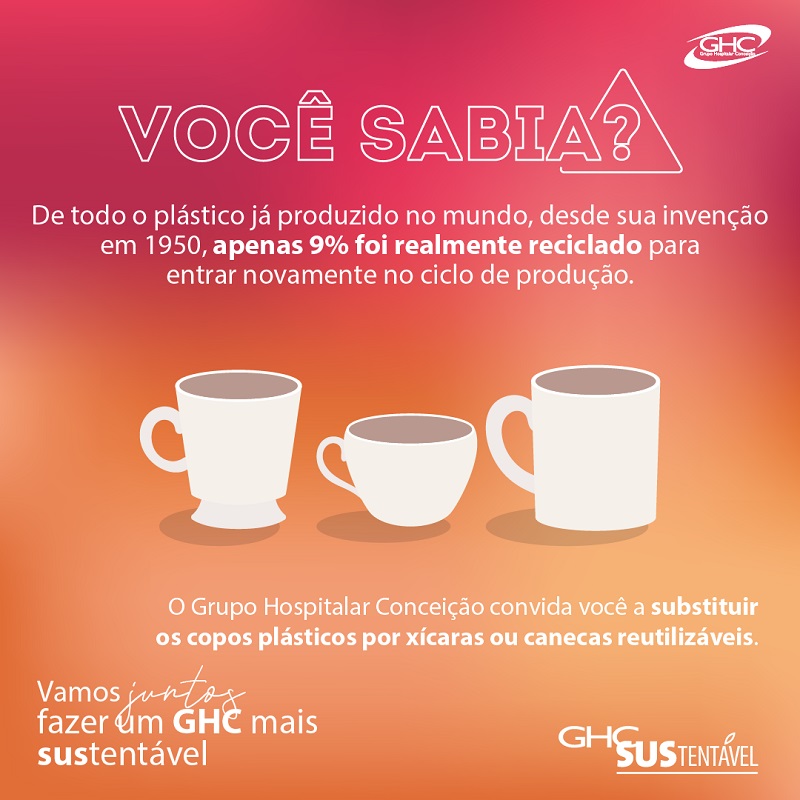 O Grupo Hospitalar Conceição lançou nesta quinta-feira, 7 de julho, uma campanha para conscientização dos colaboradores em prol da sustentabilidade, um dos valores do GHC. Por meio das redes sociais e emails institucionais, serão divulgadas semanalmente informações para o incentivo de ações que visem à redução no consumo de papel e de copos plásticos no Grupo. A campanha chama a atenção para o problema do consumo excessivo desses itens para o meio ambiente e aponta alternativas para minimizá-lo com medidas simples, como fazer uso das ferramentas digitais e substituir copos plásticos por canecas ou garrafinhas reutilizáveis.