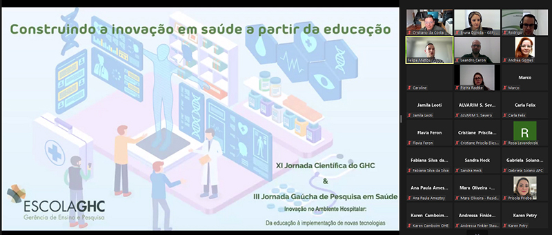 A Escola GHC realizou de forma on-line, nos dia 28 e 29 de setembro, a 11ª Jornada Científica do Grupo Hospitalar Conceição (GHC), juntamente com a 3ª Jornada Gaúcha de Pesquisa em Saúde. Este evento científico reafirma a história de incentivo à pesquisa, ensino e inovação no GHC pautada na assistência à saúde no SUS. Nesta edição, o tema central abordado, “A inovação no ambiente hospitalar: da educação à implementação de novas tecnologias”, teve o objetivo de aumentar o entusiasmo dos participantes pela inovação em saúde.