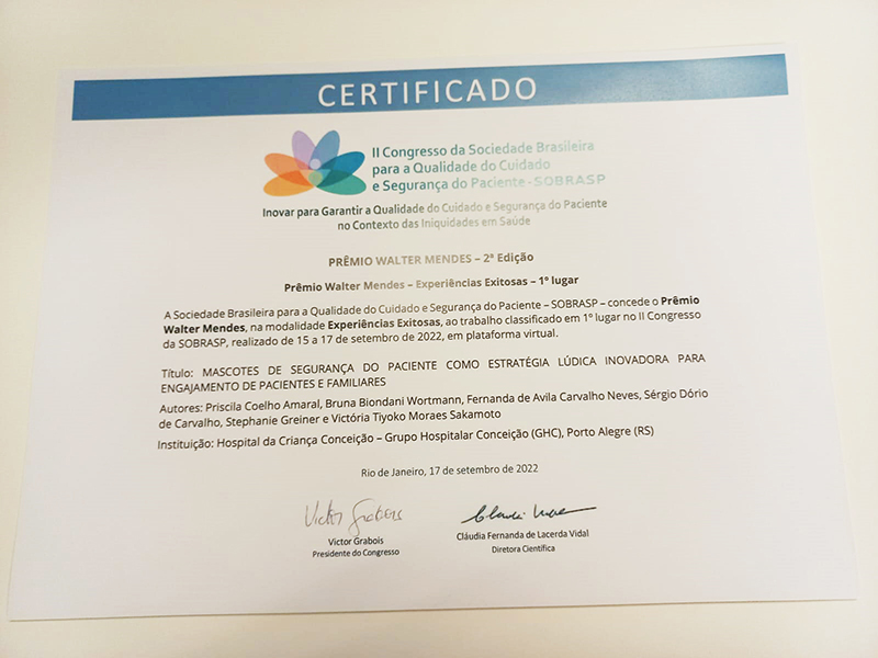 O trabalho intitulado “Mascotes de Segurança do Paciente como estratégia lúdica inovadora para engajamento de pacientes e familiares”, de autoria de Priscila Amaral, Bruna Wortmann, Fernanda Neves, Sérgio Dório, Stephanie Greiner e Victória Sakamoto, venceu em primeiro lugar na modalidade de Experiências Exitosas.