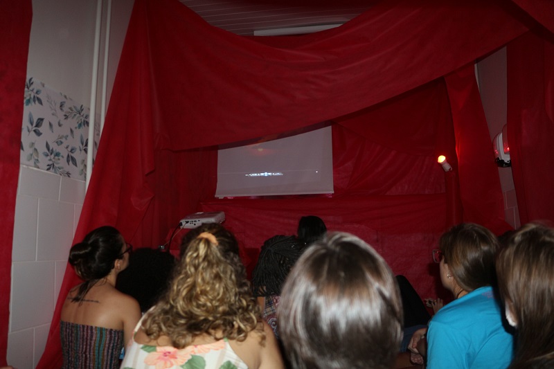 A programação iniciou com uma atividade que teve o objetivo de mostrar, de forma sensorial, como o bebê se sente no interior do útero da mãe. Residentes entraram em uma sala revestida com tecido e iluminada com uma luz vermelha, enquanto a enfermeira Raquel da Rosa, idealizadora da aula, discutiu a importância de um ambiente protegido e seguro para essa fase da vida das mulheres. A manhã foi finalizada com o filme “O Sagrado”, que traz a temática do parto e o papel do pré-natal.