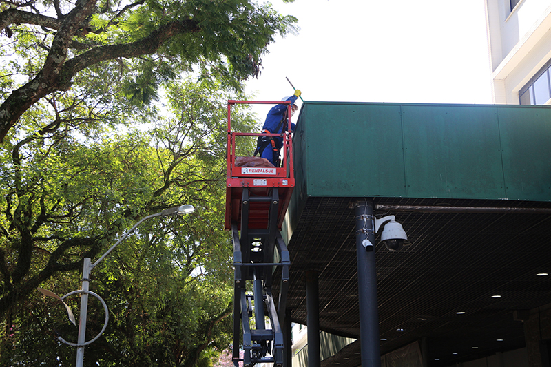 Começou na última terça-feira, 8 de agosto, a limpeza e recuperação das calhas do telhado em frente ao Hospital Conceição, área que abrange também a entrada da emergência. Os trabalhos, que devem durar uma semana se não houver mau tempo, estão sendo feitos pelos funcionários da Manutenção do Grupo Hospitalar Conceição, com o auxílio de uma plataforma de elevação, alugada, que tem a segurança necessária para a execução do serviço. Na sequência, o trabalho será estendido para as demais áreas do Hospital Conceição.