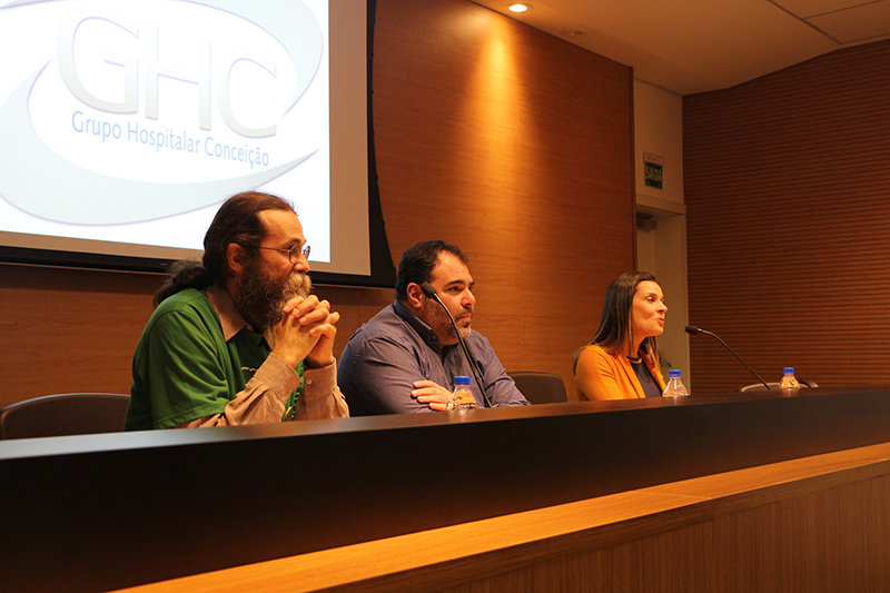 Na mesa do evento, estavam o gerente de Apoio do GHC, Eduardo Russomano, a gerente do Polo Porto Alegre da Renapsi, Andrea Alves, e o coordenador pedagógico da Escola Mesquita, Wagner Moura. A cerimônia tem como objetivo, além da entrega dos crachás, recepcionar os jovens e esclarecer dúvidas, assim como explicar sobre as regras de segurança e conduta do GHC.