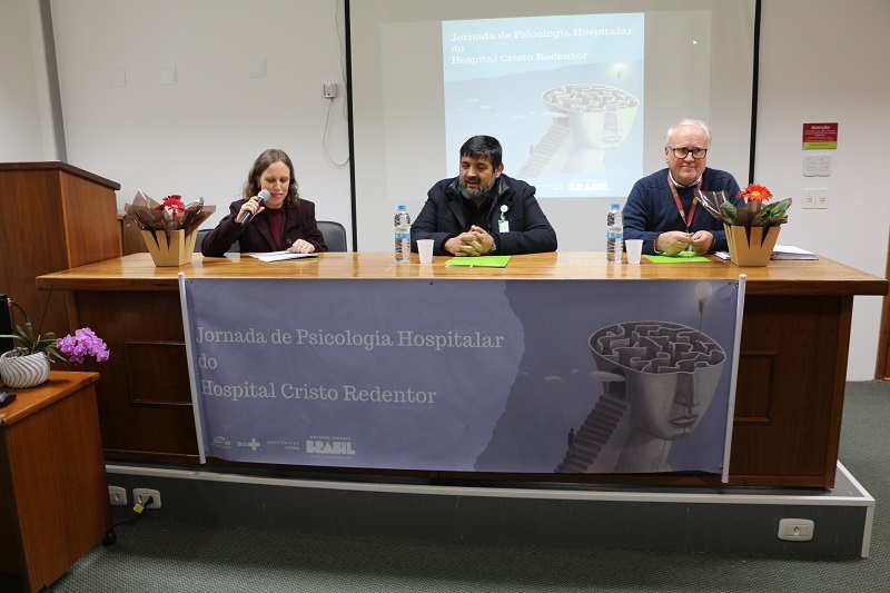 Na mesa de abertura do evento estavam os gerentes de Administração e de Internação do HCR, Carlos Roberto da Silva Xavier e Luiz Ronaldo Huber respectivamente, e a psicóloga do Serviço de Psicologia do Hospital Cristo Redentor Estefânia Zanatta.