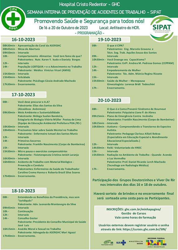Nesta segunda-feira, 16 de outubro, foi realizado, no Hospital Cristo Redentor (HCR), a abertura da Semana Interna de Prevenção de Acidentes no Trabalho (Sipat), que ocorre de 16 a 20 de outubro. O evento foi promovido pela Comissão Interna de Prevenção de Acidentes (Cipa) do HCR com o objetivo de promover palestras e atividades de capacitação para profissionais da área da saúde.