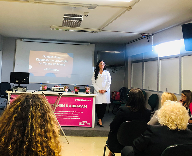 Como parte do mês de atividades em alusão à prevenção e ao combate ao câncer de mama - Fios que Acolhem e Abraçam, o Hospital Fêmina realizou na última segunda-feira, 23 de outubro, a palestra Diagnóstico e Humanização no Tratamento Oncológico. O evento contou com palestrantes especializados no assunto, com uma plateia de funcionários, profissionais e estudantes da saúde, e foi mediado pela enfermeira e coordenadora de enfermagem, Maria Cristina Magalhães. “Pra tratar de pacientes na oncologia é preciso amor, coração e acolhimento”, iniciou Maria Cristina.