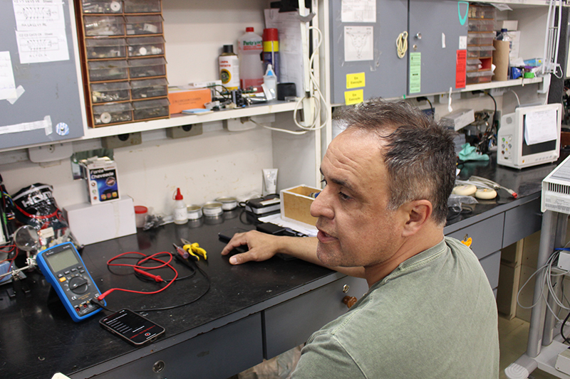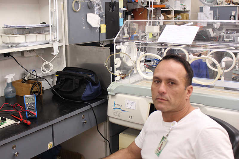 Entre esses profissionais está Anderson Pedroso da Silva, de 52 anos, e Ederson Chechi, de 45. Possuindo mais ou menos um ano de GHC, Anderson comenta que, para ele, essa área chamou muito a atenção por ser ligada à saúde. A função de apoio às áreas do hospital, na parte dos equipamentos biomédicos, ocorre quando o pessoal que atua na ponta da saúde tem alguma dificuldade, dando assim o primeiro apoio. “Muitas vezes, é questão de algum acessório, alguma coisa pontual do setor que dá pra ser resolvido na hora. Nós temos um trabalho importante para fazer, uma retaguarda para os funcionários da área da saúde especificamente. A gente acaba dando esse apoio para eles, no meu caso no Bloco Cirúrgico. Muitas vezes, no meio de uma cirurgia, algum equipamento apresenta alguma falha e somos nós quem atua lá pra fazer esse primeiro atendimento, então a gente atua basicamente em campo”, relata Anderson ao ser perguntado sobre a importância de um técnico em eletrônica.