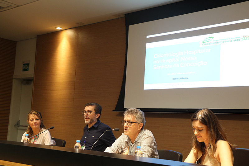 A mesa de abertura do evento, além de Elisa, foi composta pelo gerente de Unidades de Internação do HNSC Sati Mahmud, pelo responsável técnico da Odontologia do GHC, Egídio Demarco, e pela assistente de coordenação do Centro de Especialidades Odontológicas do GHC, Roberta Garcia.