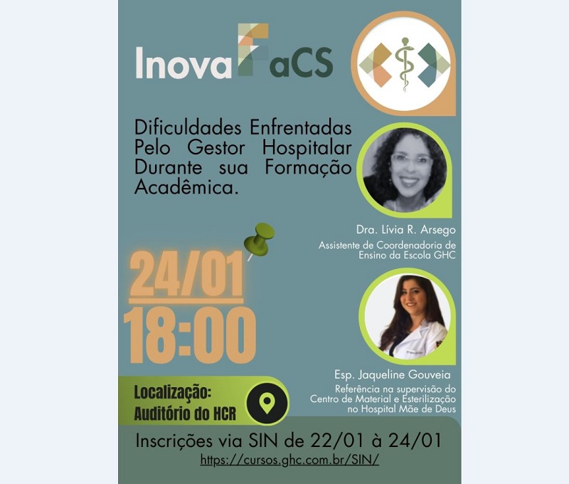 Os/as discentes da turma 4 do curso de Gestão hospitalar da Escola GHC, convida para participar do "InovaFaCS: As dificuldades enfrentadas pelo Gestor Hospitalar durante sua formação acadêmica", no dia 24/01 às 18h, no Auditório do Hospital Cristo Redentor. O evento é parte da disciplina do segundo semestre Projeto Integrador II, ministrada pela professora Juliane Meira Winckler, que objetiva integrar os diversos temas trabalhados durante o semestre promovendo a identificação de aspectos estratégicos da gestão, do planejamento e da tomada de decisão em saúde.
