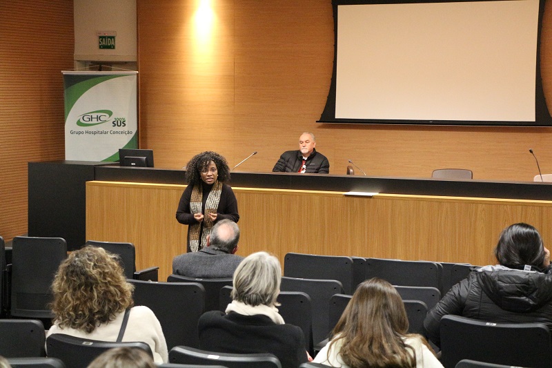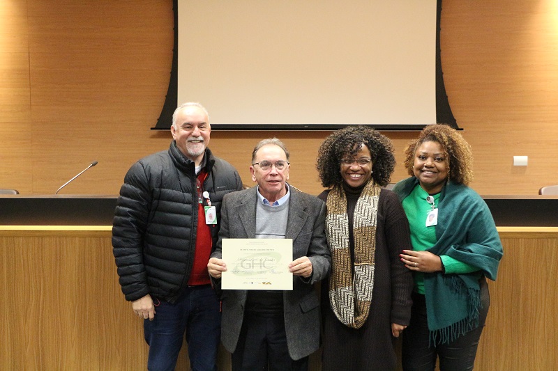 Com o propósito de reconhecer à dedicação ao GHC ao longo dos anos, a Gerência de Gestão de Pessoas (GGP/GHC) e a Diretoria Executiva promoveram na terça-feira, 9 de julho, no Auditório Jahyr Boeira, uma homenagem aos trabalhadores e trabalhadoras que estão encerrando o ciclo na instituição, por aposentadoria ou comum acordo. "A história do GHC 100% SUS foi construída pelo trabalho destes funcionários que hoje estão aqui e, sem dúvida, deixaram sua marca", ressalta a gerente do setor, Lisiane Vieira. Também participaram da solenidade o diretor de Atenção à Saúde do Grupo, Luís Antônio Benvegnú, e a diretora de Inovação, Gestão do Trabalho e Educação, Quelen da Silva.