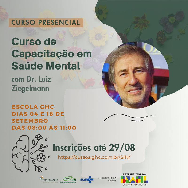 O Grupo Hospitalar Conceição está promovendo um curso de capacitação em Saúde Mental, na modalidade presencial, com o médico psiquiatra Luiz Ziegelmann. As inscrições já estão sendo realizadas e vão até o dia 29 de agosto. O curso ocorrerá no período da manhã, das 8h às 11h, nos dias 4 e 18 de setembro, na Escola do GHC.