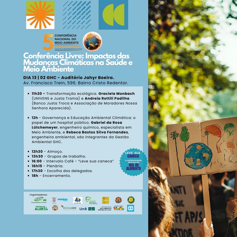 Será realizada, nos dias 11 e 13 de fevereiro, a Conferência Livre: Impactos das Mudanças Climáticas na Saúde e no Meio Ambiente, promovida pelo GHC em conjunto com outras entidades, com o objetivo de debater com profissionais de saúde, estudantes, povos originários e tradicionais sobre a concepção do ser humano integral em composição com a natureza; o impacto das mudanças climáticas na saúde e estratégias de adaptação e mitigação para seu enfrentamento.