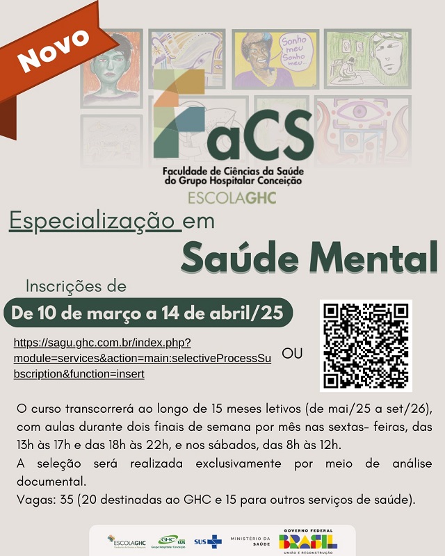 A Faculdade de Ciências da Saúde do Grupo Hospitalar Conceição (FACS) abre as inscrições nesta segunda-feira para o curso de especialização em Saúde Mental em nível de pós-graduação. O curso tem duração de 15 meses letivos, com início em maio, dispondo de 35 vagas (20 vagas destinadas ao GHC e 15 vagas para outros serviços de saúde).