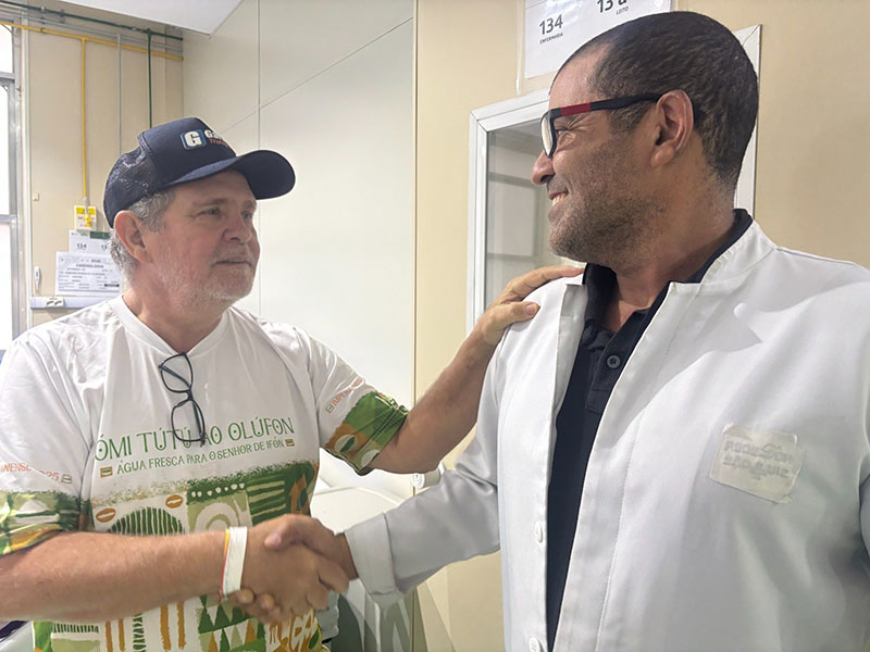 “Cheguei aqui para fazer um exame de cateterismo, quando verificaram a urgência da cirurgia e imediatamente me internaram. Foi uma cirurgia de alto risco, mas de grande sucesso. Estou muito grato a todos, sem exceção”, afirmou Raimundo, ao abraçar o responsável pela Enfermagem do setor, Irineu Sodré.