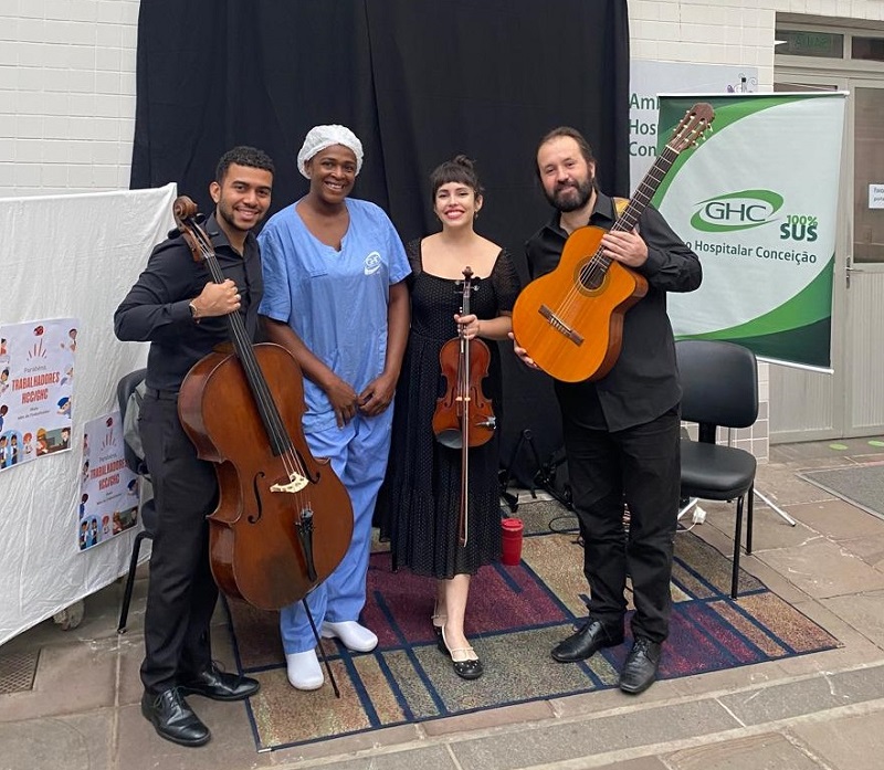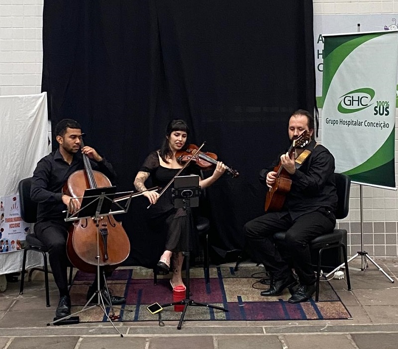 A proposta contou com apresentações do Elias Barboza Quarteto – quarteto de música brasileira, choro - e do Miriã Farias Trio – trio de violino, violão e violoncelo –, realizadas em espaços de circulação dos funcionários do GHC, garantindo visibilidade e acesso. As apresentações ocorreram em horários distintos, contemplando diferentes turnos de trabalho, o que permitiu alcançar um número maior de profissionais.
