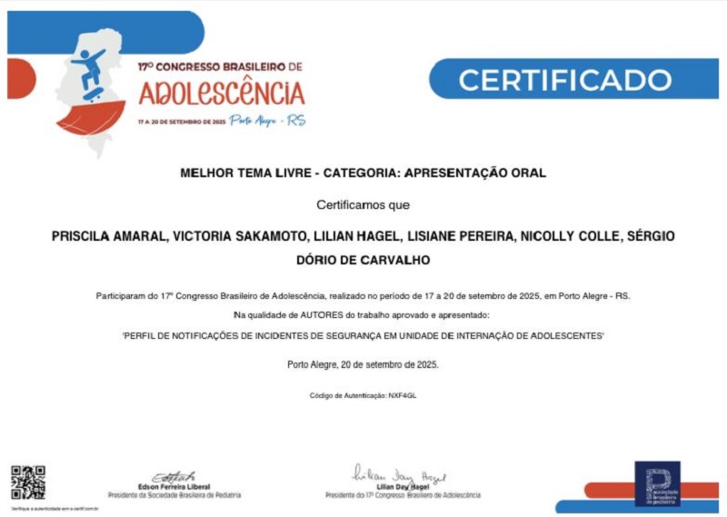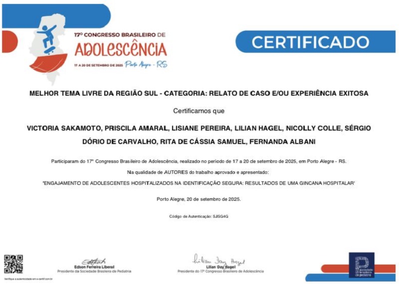 A produção científica da equipe foi reconhecida nacionalmente, conquistando premiação em duas categorias das apresentações orais, nas modalidades de Melhor Tema Livre Região Sul e Melhor Tema Livre Geral, ficando entre os três melhores trabalhos apresentados no evento. Esse resultado reforça o compromisso do serviço com a excelência no cuidado e a valorização da saúde integral de adolescentes.